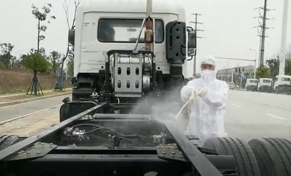 东风商用车生产基地在湖北十堰疫情重灾区,东风商用车的物流司机将底盘车送至湖南境内的高速路口岳阳北收费站后返回湖北集中隔离,再由易倍emc环境的物流司机接回厂区。整个交接运输过程中,每一辆底盘车在出厂、高速路口、易倍emc环境长沙园区必须经历三次的专业消毒,确保安全,万无一失。