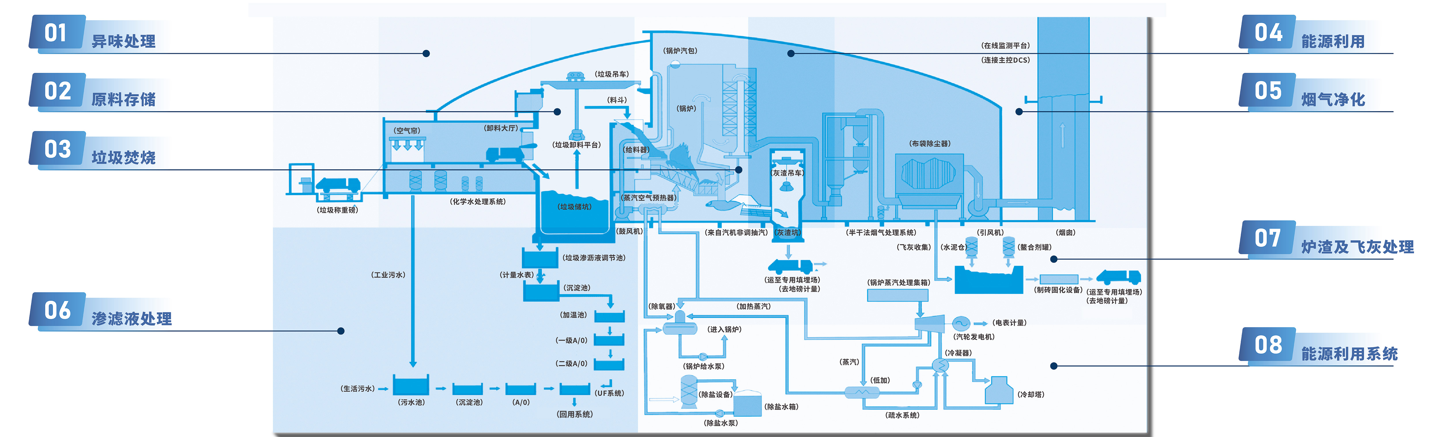 易倍emc环境生活垃圾焚烧发电处理模式将全流程划分为八大模块,构建囊括垃圾入库、储存、焚烧,烟气净化、渗滤液处理、炉渣及飞灰处理、热能产生、能源利用的八大系统。